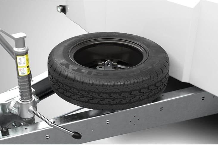 Voor het transport van reservewielen en banden met een hooggeplaatst bandenrek. De wielen worden boven de gemiddelde motorkaphoogte geplaatst, waardoor bruikbare ruimte op het laadbed behouden blijft. Veiligheid wordt geboden door een bandsysteem met hangslot.